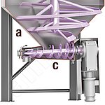 使用螺旋搅拌工具 (a) 进行温和的均质化。螺旋之间可选择安装灵活的刮刀 (b)。在混合功能中,产品被向上输送。在排放时,搅拌工具反向旋转,将发酵产品向下输送到锥形的计量系统(c)。这样可以非常精确(连续)地计量排放。