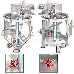 严格来说,上述混合过程(“分散混合”)是通过混合工具更快的旋转运动来实现的。此外,在混合室中安装了一到两个快速旋转的刀具/高剪切刀片/转子-定子系统。在混合过程中,混合物的颗粒会受到强烈的剪切、冲击和压缩作用。输入混合物的功率与圆周速度的二次或三次方成正比。根据混合过程的持续时间,混合物的温度可能会出现可测量的升高。