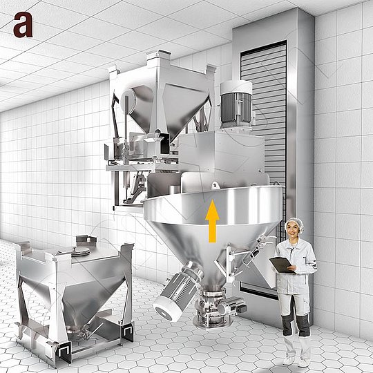 各种粉末成分被加工处理。由此制成预混合物(预混合物是高浓度的)和主混合物。如果在同一个混合机中制备预混合物和主混合物,混合过程将缩短。病原体负荷将减少。